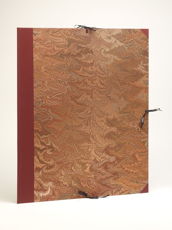 Marbled paper is also a craft with a long history. Discovered over 1,000 years ago, marbled paper is created by floating paints on water to create delicate, one-of-a-kind designs. The pattern is printed and trimmed to decorate the outside and inside covers of the book. Our marbled paper, handmade in house by the artist, mirrors a classic pairing of book and paper arts.